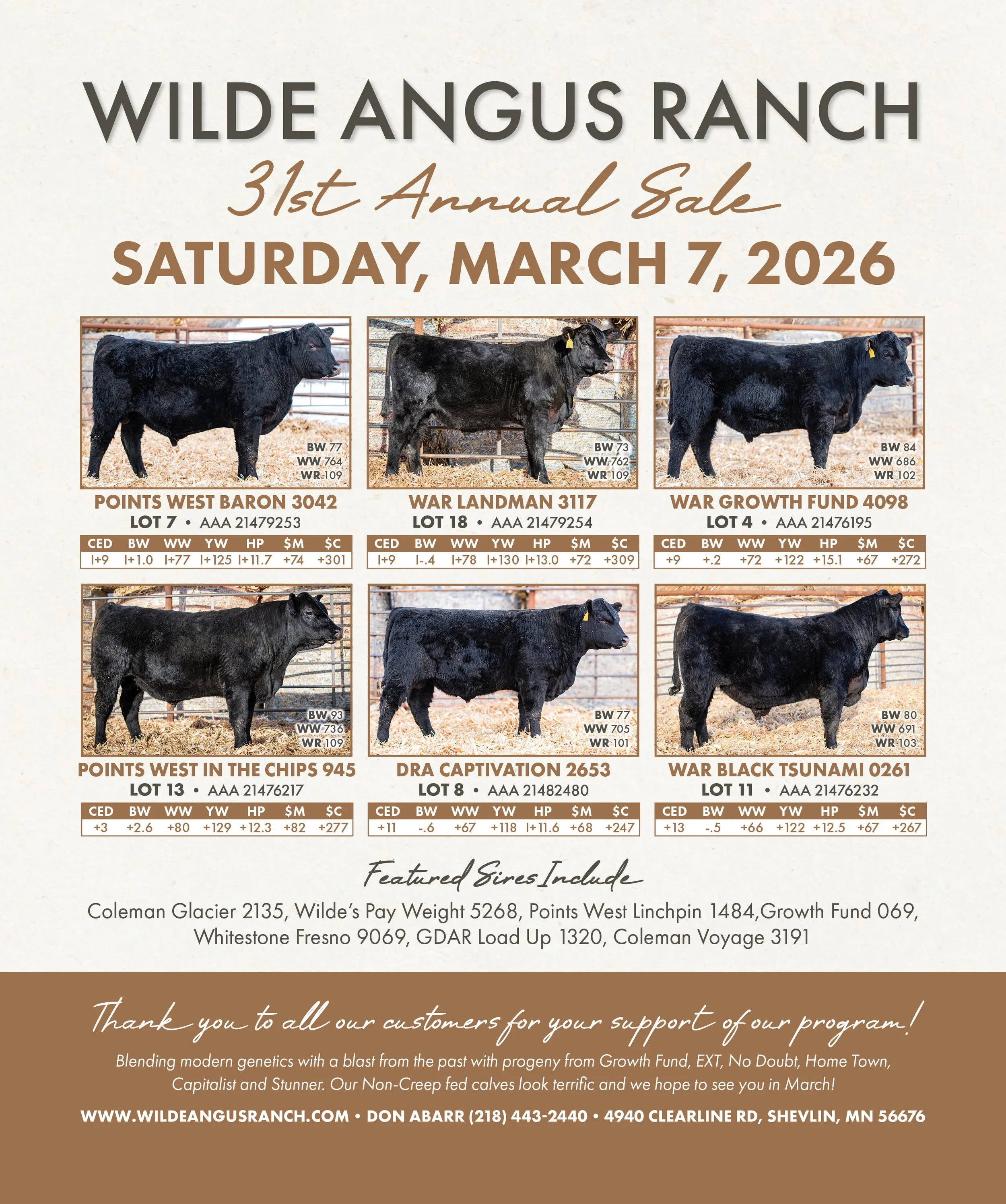 We welcome you to our bull sale this March that occurs on the first Saturday of the month every year. Whether you are an old friend coming back to visit or a fellow cattleman looking to expand, we invite you to join us on March 7th.